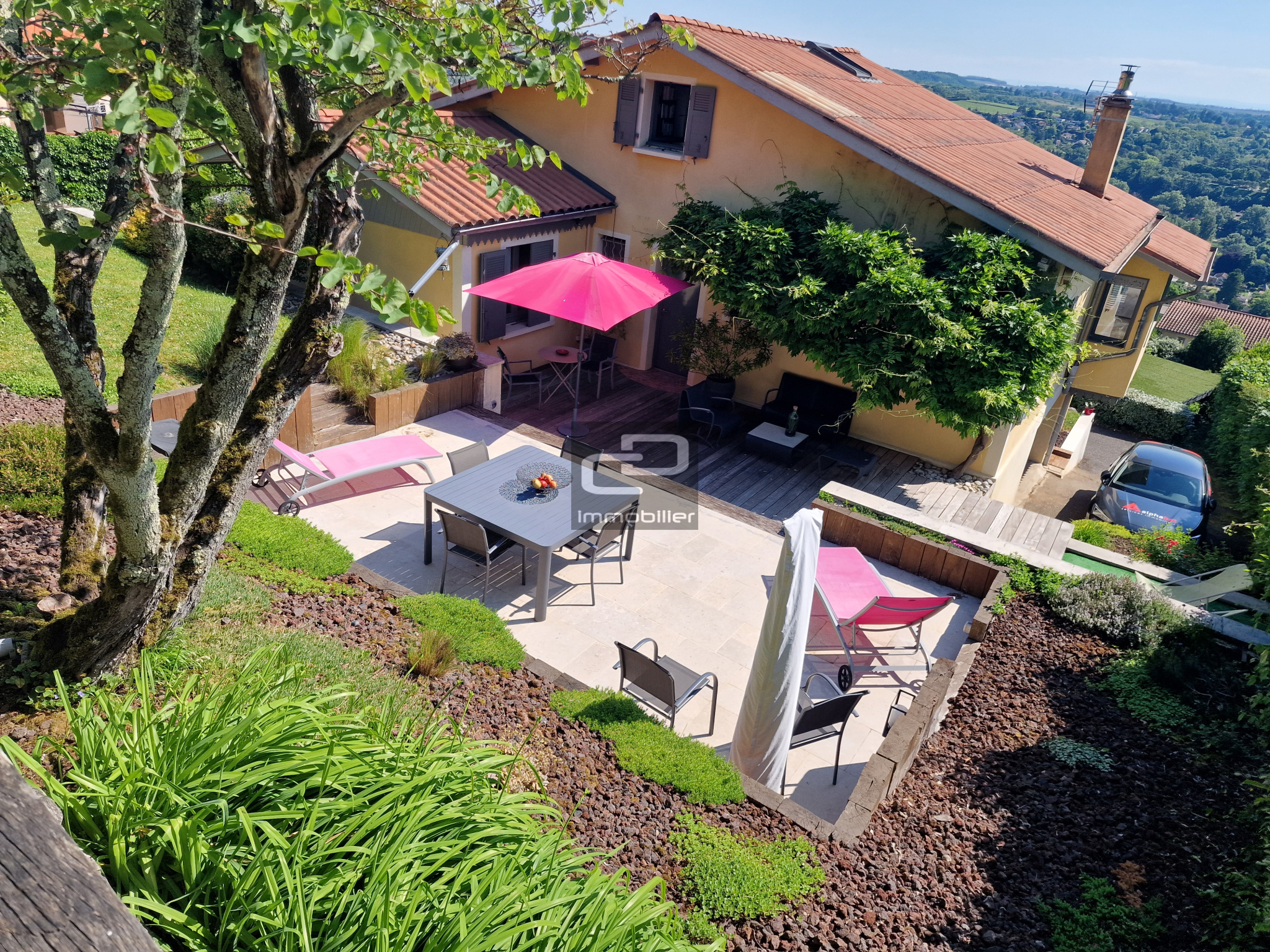 Idéalement orientée Est-Sud-Ouest, lumineuse et offrant un panorama exceptionnel sur le Val de Saône, cette villa vous séduira immédiatement. Composée d'une superbe pièce de vie de 61 m² sur vue, avec cuisine ouverte, et accès de plain-pied sur terrasse à l'ouest et jardin, ce niveau dessert également un bureau, une salle de bains, une chambre et un wc. A l'étage, un charmant espace nuit, composé d'une mezzanine desservant deux chambres et une salle d'eau avec wc. La terrasse au sud-ouest offre une intimité précieuse, et le terrain de boules une seconde vue à couper le souffle. L’aménagement paysagé des extérieurs offre un sentiment de repos et de bien-être. La propriété est en excellent état d'entretien avec toutes les prestations contemporaines. Le parquet de la pièce de vie est remarquable, le poêle à bois offre une chaleur douce en complément du confort de la pompe à chaleur. L'environnement résidentiel individuel octroi un calme complet des lieux, une vue dégagée sur le panorama du val de Saône. Pour parfaire le confort, la maison dispose d’un garage, d'un espace buanderie, d'une cave et d'un carport. Une maison pleine de charme, de qualités et d'atypisme pour les amateurs de confort, que je vous propose de découvrir.
