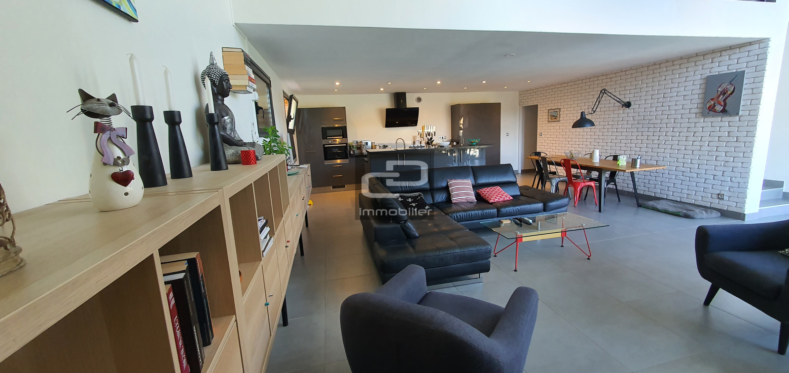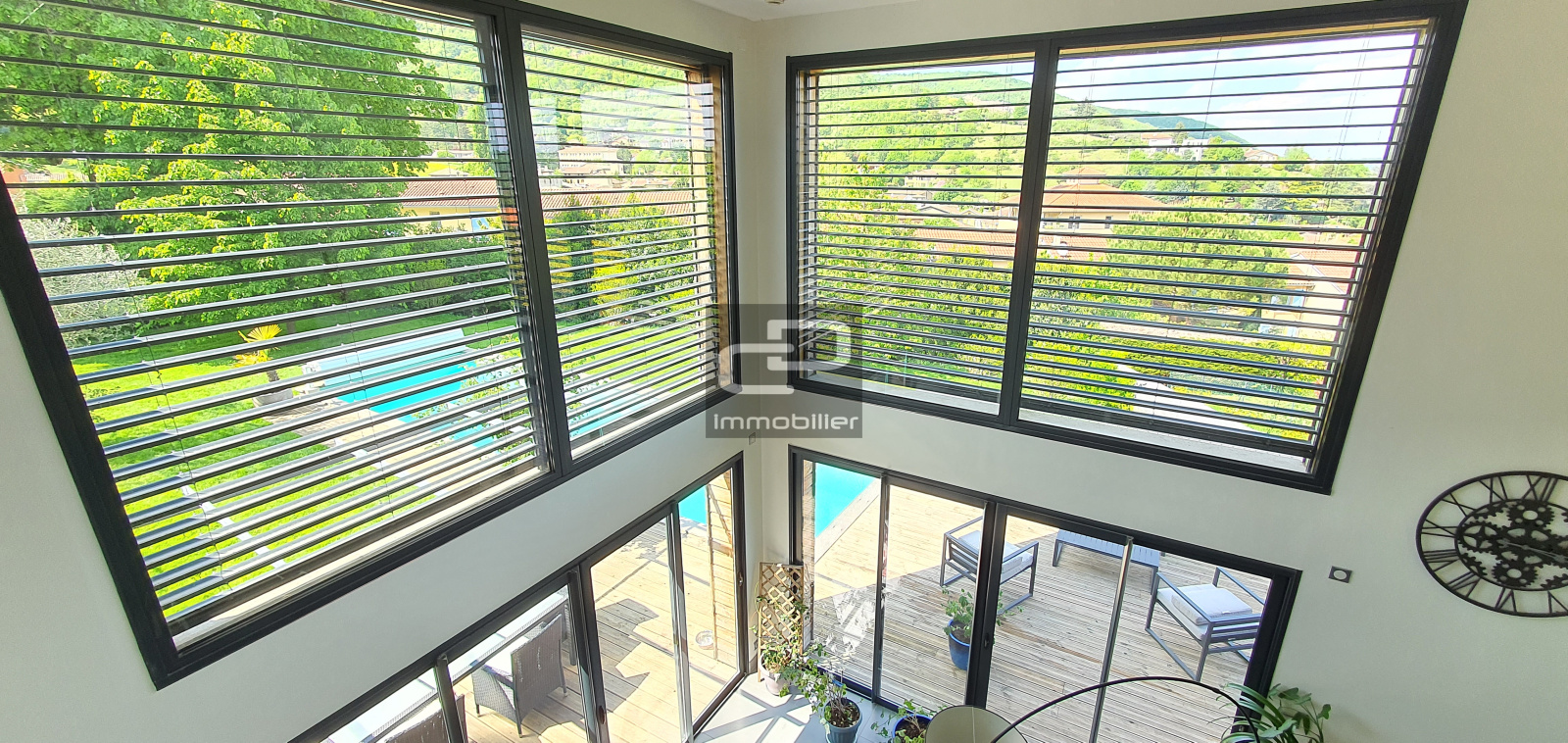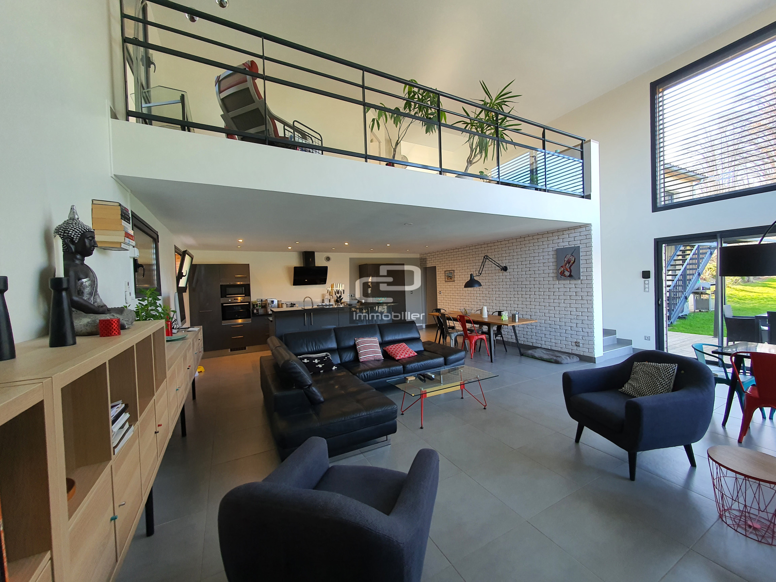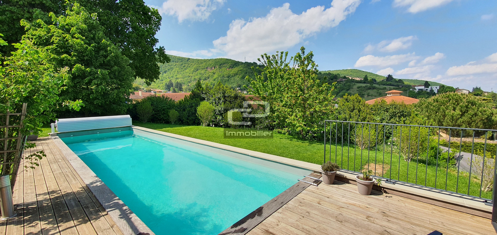 A vendre en exclusivité, en plein coeur du magnifique village en pierres dorées de Saint Romain au mont d'or, superbe maison contemporaine de 205 m2 au calme et sans vis-à-vis sur une parcelle de 1132 m2. Superbe vue sur les monts d'or et le val de Saône. Cette maison de 2010 en parfait état sur 2 niveaux, se compose en rez de jardin d'une vaste pièce à vivre de plus de 65 m2 avec son plafond cathédrale, sa cheminée et ses baies vitrées rendant ce lieu unique, ouvert sur la cuisine américaine aménagée et équipée donnant accès sur les terrasses, un cellier, un WC et un locale technique. Au rez-de-chaussée, l'espace nuit offre 5 chambres donnant sur un balcon dont une suite parentale climatisée avec son dressing et sa salle de bains comprenant une baignoire, une double vasque, une douche italienne et un WC. Ce niveau comprend également une salle de bains commune équipée d'une baignoire et une double vasque, un cellier, une entrée, un WC et une mezzanine. Le stationnement est assuré par un garage double avec une mezzanine pour le rangement. Ce bien offre de belles prestations, chauffage au sol dans la pièce à vivre, volets roulants électriques et centralisés, brise-soleil orientables, vmc double flux, récupération d'eau de pluie, panneaux solaires pour l'eau chaude, chaudière à condensation au gaz de ville, double vitrage, visiophone, connexion fibre, placards muraux. Le grand jardin clos et paysagé avec piscine 3 X 11 chauffée par une PAC, traitement par lampe UV et équipée d'un volet électrique.